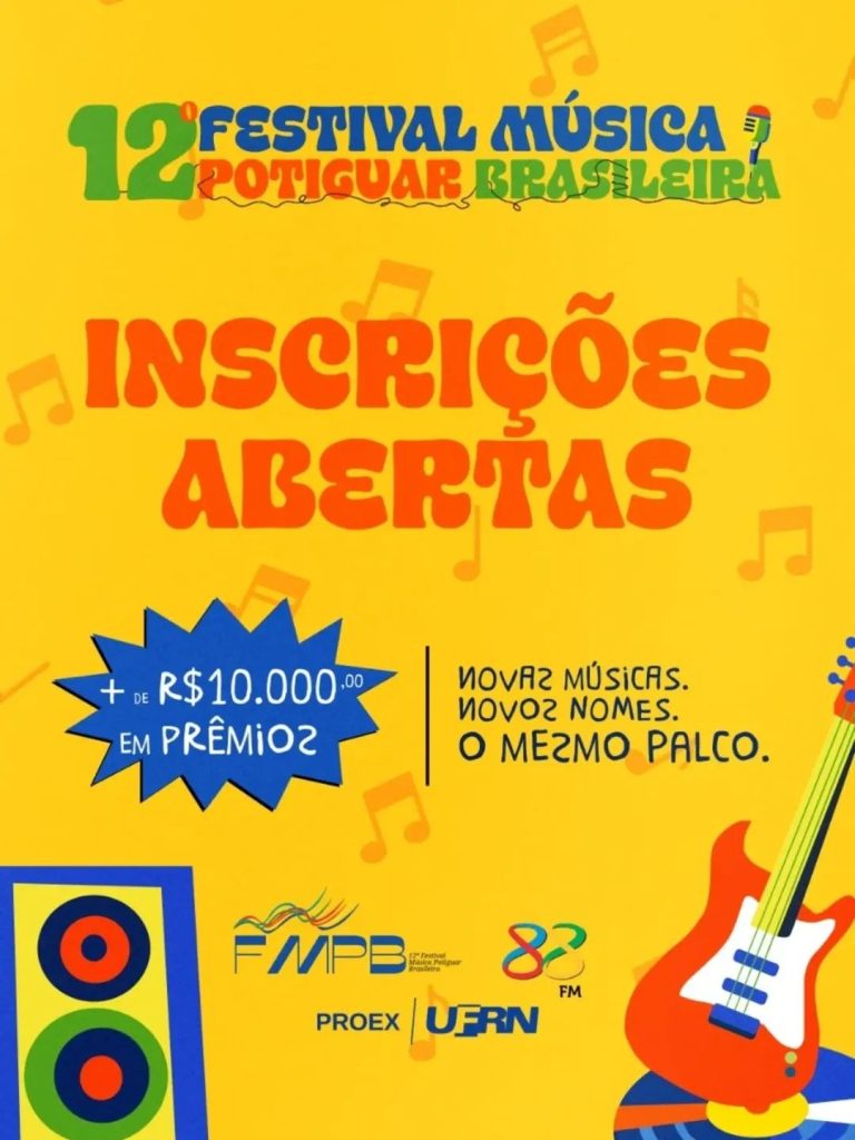 As inscrições para o 12º Festival de Música Potiguar Brasileira (FMPB) foram prorrogadas até o dia 30 de abril. O festival recebe inscrições de artistas do Rio Grande do Norte com composições inéditas, sejam elas com letras e/ou instrumentais. A iniciativa é organizada pela Pró-Reitoria de Extensão (Proex) da Universidade Federal do Rio Grande do Norte (UFRN), em parceria com a Rádio Universitária (FMU).