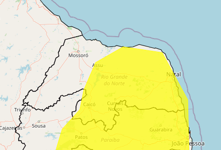 Já o segundo aviso é classificado como “Perigo Potencial”, o nível mais baixo na escala de severidade. A previsão é de chuvas entre 20 e 30 mm por hora ou até 50 mm por dia, com ventos de 40 a 60 km/h. Esse alerta atinge um número ainda maior de cidades do estado, incluindo Natal, Parnamirim, Ceará-Mirim, Caicó, Currais Novos, Nova Cruz, Santa Cruz, São Gonçalo do Amarante e Macaíba.