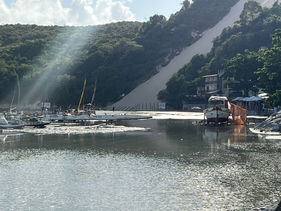 A água ficou acumulada sobre a faixa de areia e parte do volume escorreu para o mar em uma espécie de rio que se formou no pé do Morro do Careca. Com a força da água, a cerca do morro caiu.